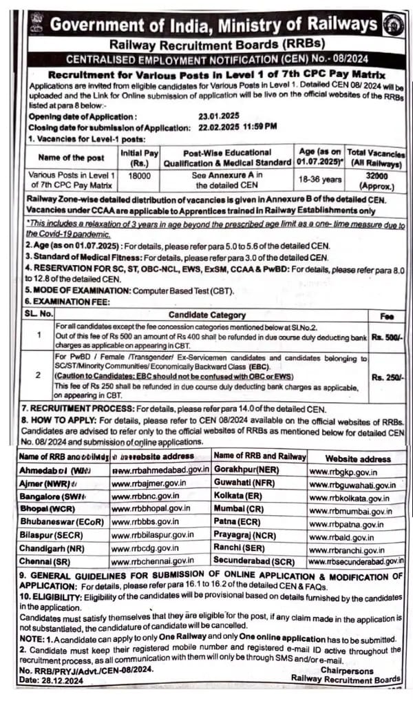 All information is sourced from the official website of the Railway Recruitment Board (RRB)https://indianrailways.gov.in. Candidates are strongly advised to visit the official website for verification of all details, official notifications, and updates.